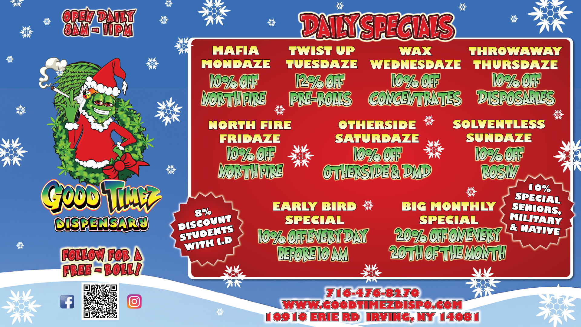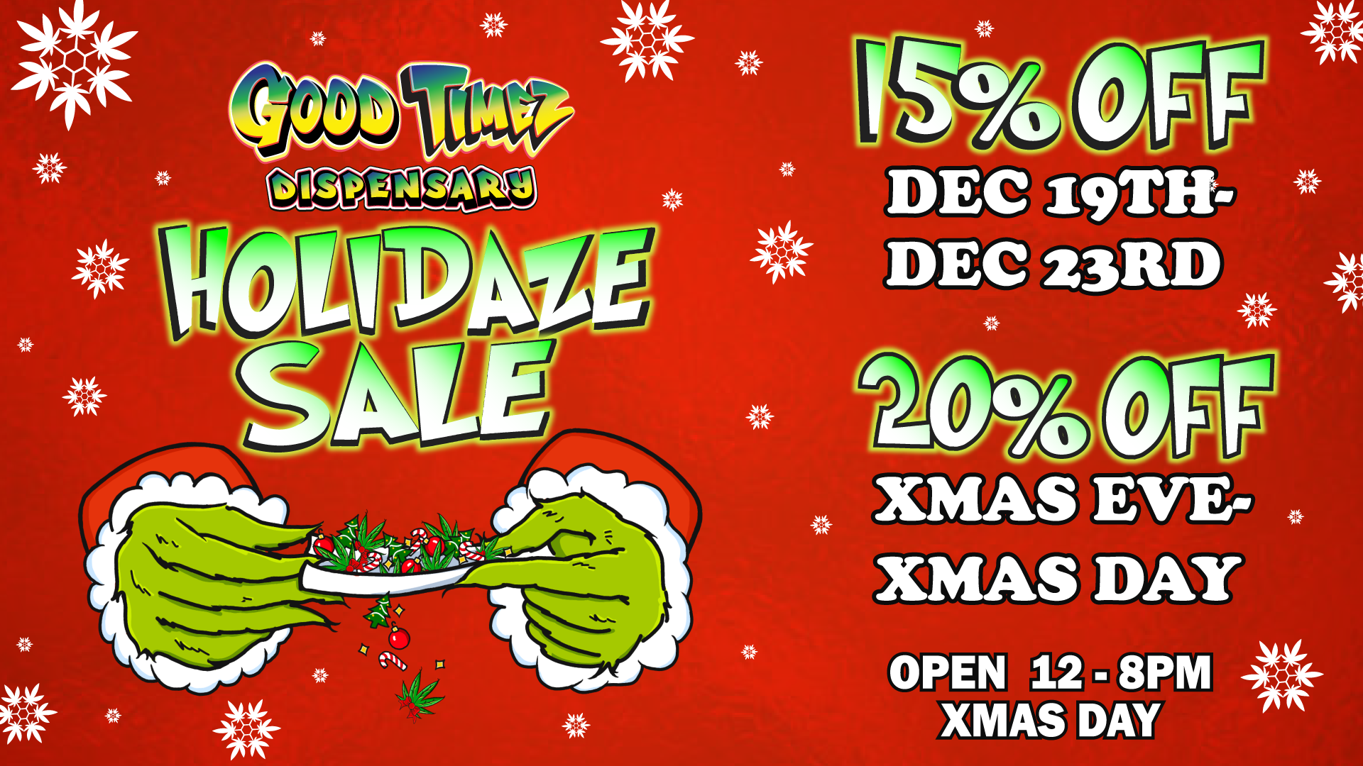 Good Timez Dispensary's Labor Day Weekend Sale!   August 29th - August 31st 15% OFF THE ENTIRE STORE! Stop in and put your name into the