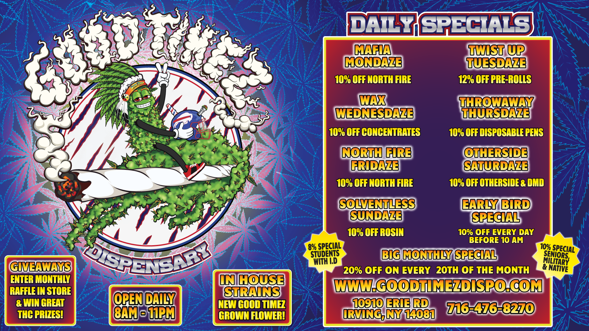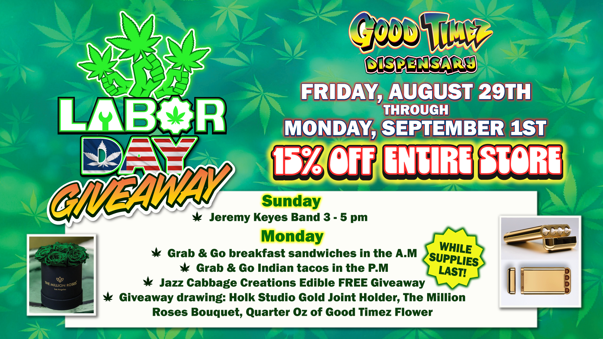Good Timez Dispensary's Labor Day Weekend Sale! August 29th - August 31st 15% OFF THE ENTIRE STORE! Stop in and put your name into the